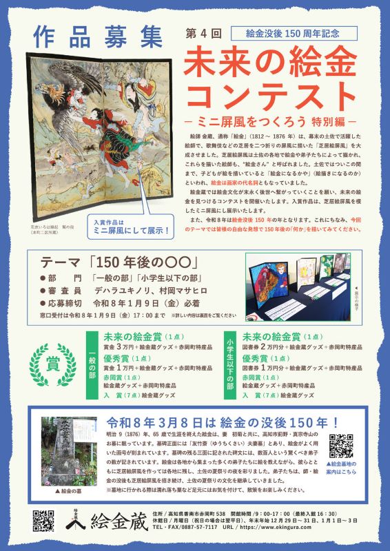 絵師 金蔵、通称「絵金」(1812~1876年)は、幕末の土佐で活躍した絵師で、歌舞伎などの芝居を二つ折りの屏風に描いた「芝居絵屏風」を大成させました。 芝居絵屏風は土佐の各地で絵金や弟子たちによって描かれ、これらを描いた絵師も、“絵金さん”と呼ばれました。 土佐ではついこの間まで、子どもが絵を描いていると「絵金になるかや」(絵描きになるのか)といわれ、絵金は画家の代名詞ともなっていました。 絵金蔵では絵金文化が末永く後世へ繋がっていくことを願い、未来の絵金を見つけるコンテストを開催いたします。 入賞作品は、芝居絵屏風を模したミニ屏風にし展示いたします。 また、令和8年は絵金没後150年の年となります。これにちなみ、今回のテーマは「150年後の〇〇」。 皆様の自由な発想で150年後の「何か」を描いてみてください。 〈主催者からのご案内〉