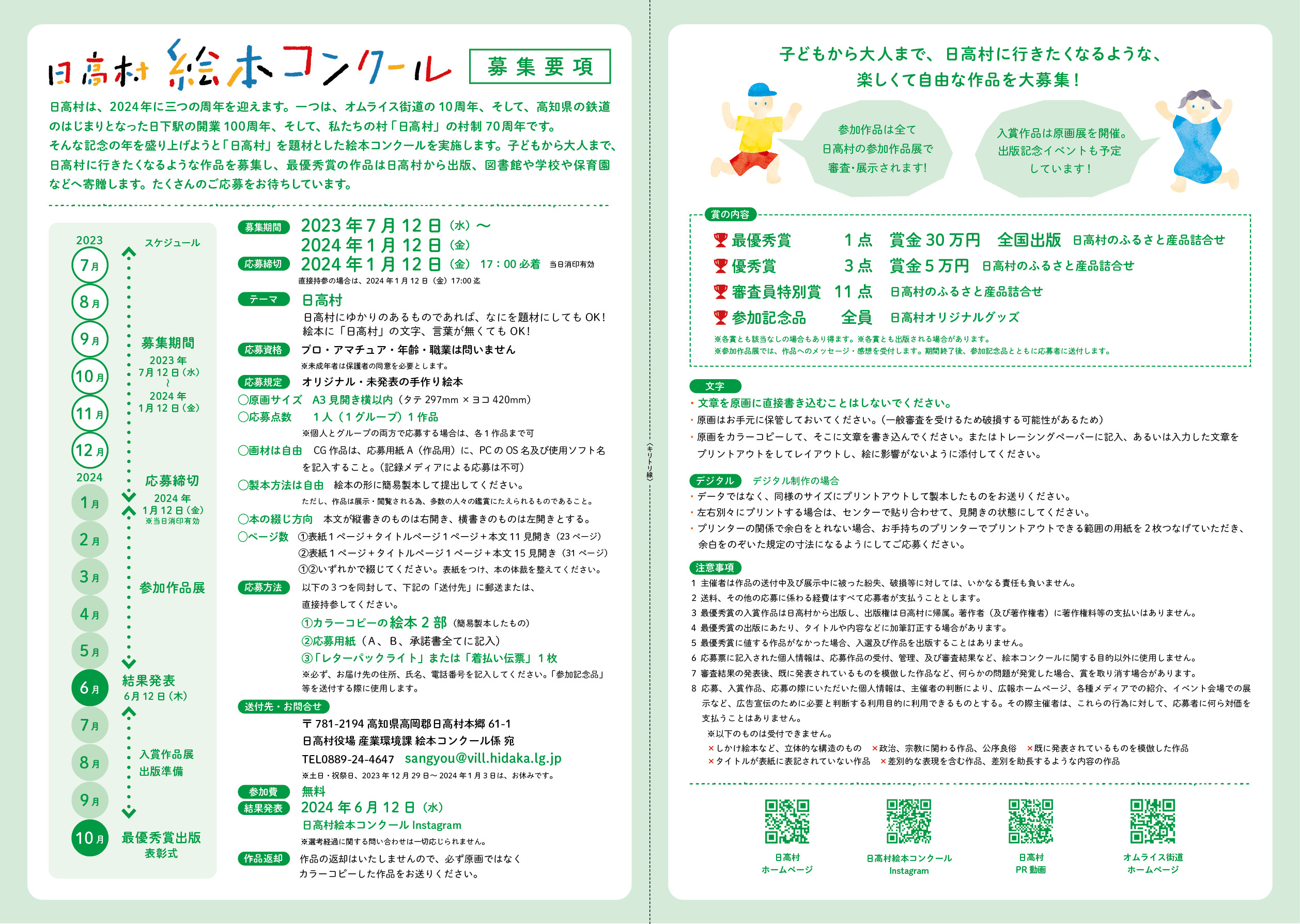 日高村は、2024年に3つの周年を迎えます。一つはオムライス街道10周年、二つめは高知県の鉄道のはじまりとなった日下駅の開業100周年、そして私たちの村「日高村」の村制70周年です。この記念の年を皆さんと一緒に盛り上げたいとの思いから、3つの周年事業をまとめて『村制70周年記念事業』として日高村絵本コンクールを開催します。(主催者WEBサイトより)