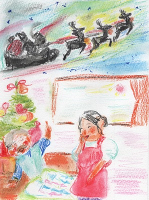 私はサンタのそりに乗って、プレゼント配りを手伝ったんだよ」